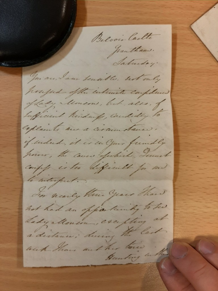 I cannot express to you how happy I shall be to find you perfectly well upon my return from Belvoir. I am going tomorrow morning, and stay till Saturday; and do not judge my good wishes to be merely the insult of self-interest, though I must confess my earnest solicitude to speak to you upon a subject which in affectionate appreciation to “a though reasons” is still constantly […] in my mind.