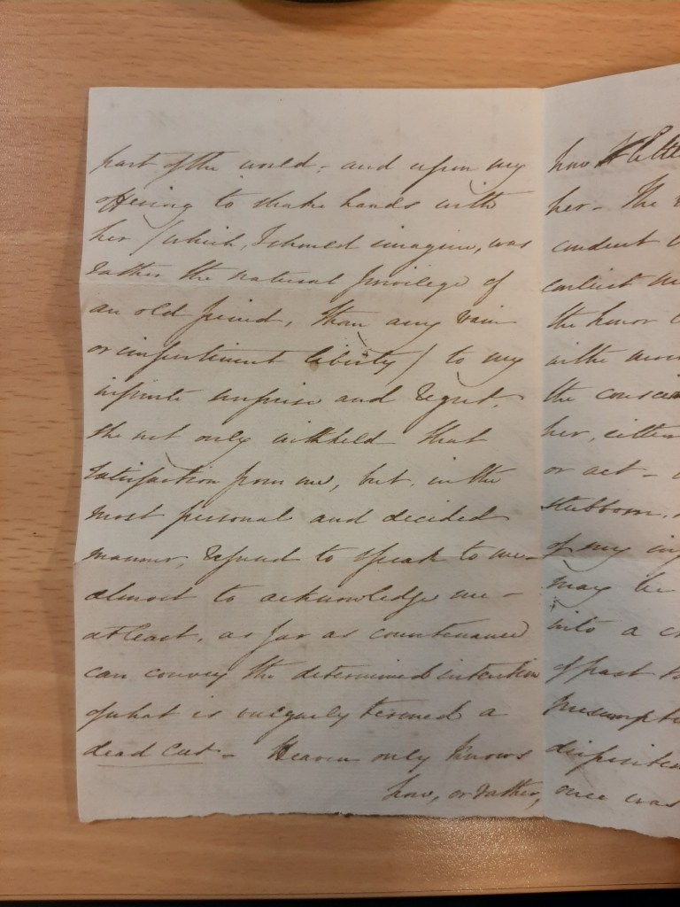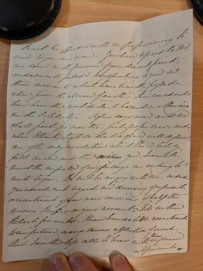 Do not be offended with me for presuming to write to you once more – you have refused to see me even in the presence of your dearest friend, and almost forbade my speaking to you in those moments, which have recently passed, when, from the absence of another, there could not have been the most distant hazard allowing me that liberty. A few days more, and we shall part for months – perhaps for ever, and, when I think that so short a space will deprive me of the only consolation which I have lately felt inured and then meeting you.
