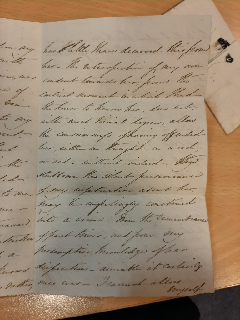 Heaven only knows how, or rather how little, I have deserved this from her. The retrospection of my own conduct towards her, from the conduct moment in which I had the favour to know her, does not, with much trivial degree, allow the consciousness of having offended her, either in thought, in word, or act – without indeed my stubborn, the silent perseverance of my infatuation about her, may be unfeelingly construed into a crime – from the remembrance of past times, and from my presumptive knowledge of her disposition – amiable it certainly once was – I cannot allow myself to reflect upon her by encouraging the supposition that her for bidding reserve towards me was actuated by her own individual judgement.