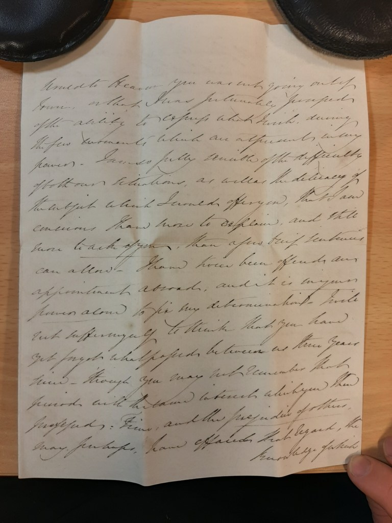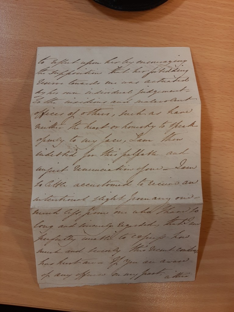 To the insidious and malevolent offices of others, such as have neither the heart or honesty to speak openly to my face, I am then indebted for this palpable and unjust renunciation of me – I am so little accustomed to receive an intentional slight from anyone – much less, from one who I have so long and sincerely regarded, that I am perfectly unable to express how much and severely this recent conduct has hurt me. If you are aware of any offence on my part, either…[letter ends]