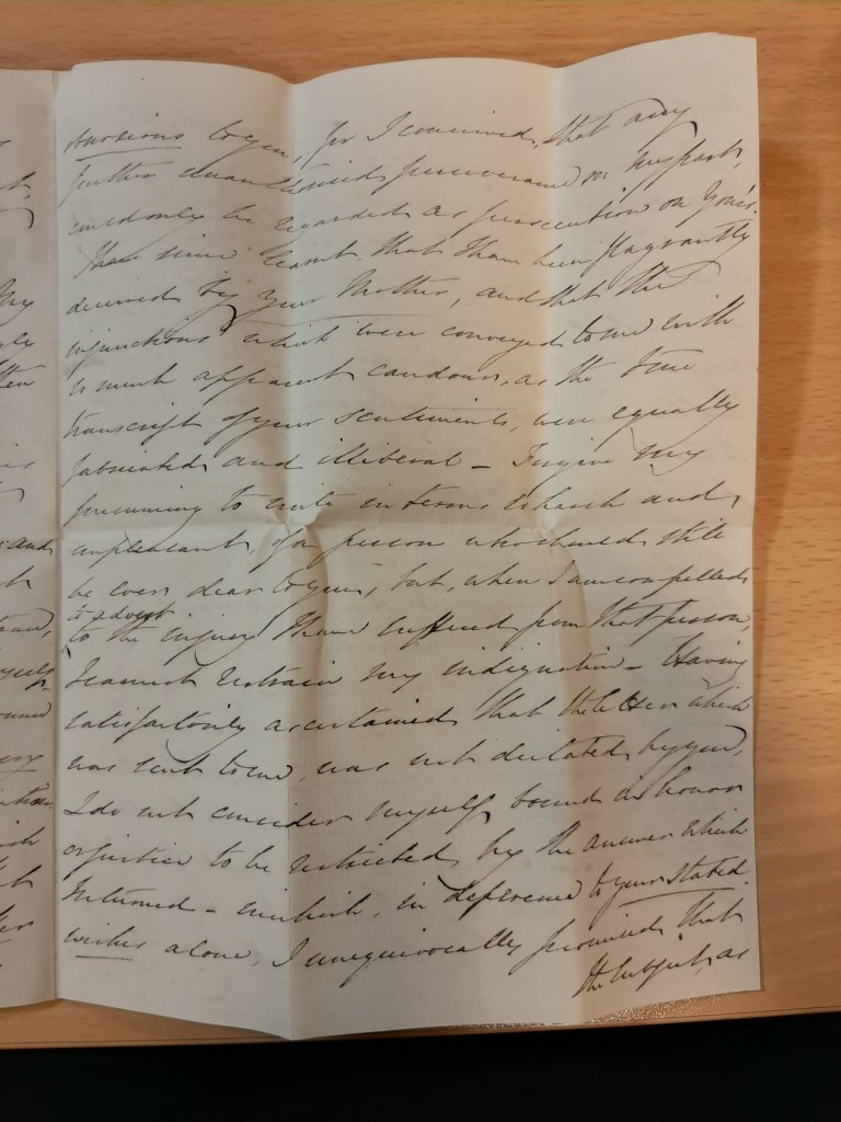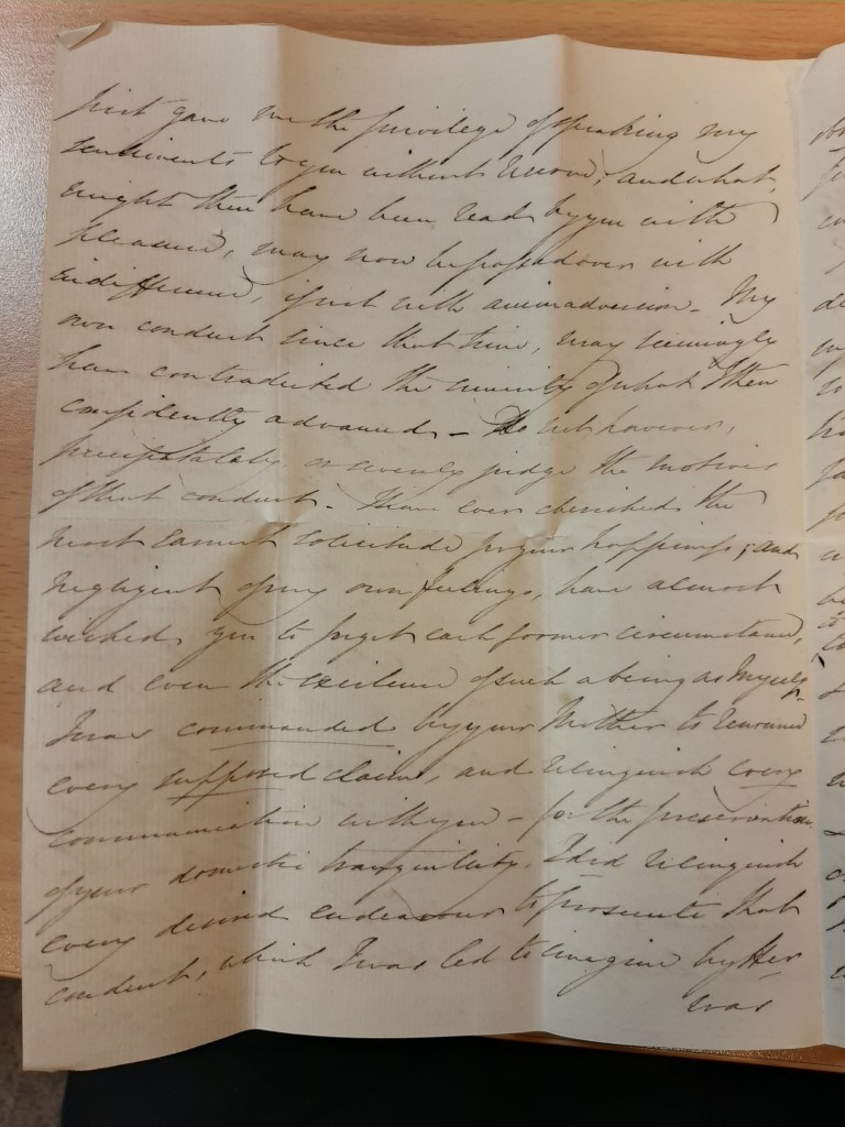 first gave me the privilege of speaking my sentiments to you without reserve, and what might then have been read by you with pleasure, may now be passed over with indifference, if not with animadversion. My own conduct since that time, may seemingly have contradicted the amity of what I then confidently advanced, to not have even precipitately or evenly judge the motives of that conduct, I have ever cherished the most earnest solicitude for your happiness and negligent of my own feelings, have almost wished you to forget each former circumstance and even the existence of such a being as myself, I was commanded by your mother to end every supposed claim and relinquish every communication with you, for the preservation of your domestic tranquillity. I did relinquish every desired endeavour to prosecute that conduct, which I was led to imagine by her was obnoxious to you, for I conceived that any further […] perseverance on my part could only be regarded as persecution on yours.