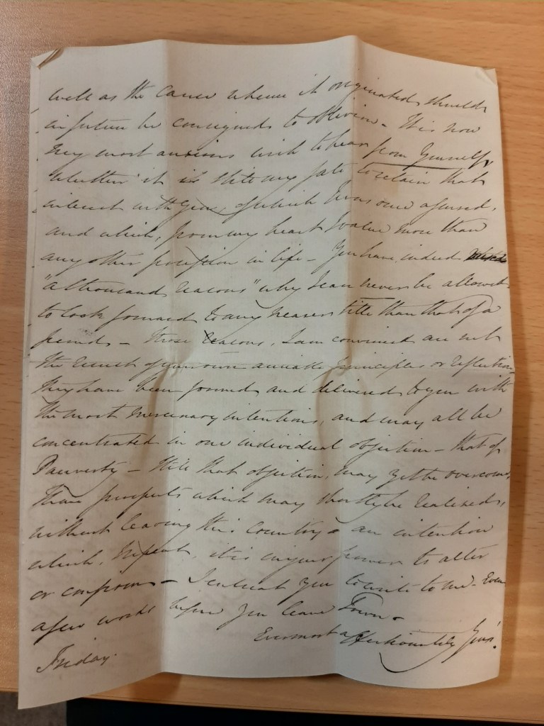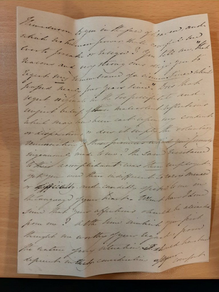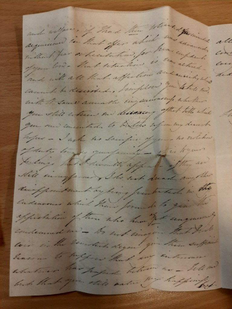 I should have been disquiet in my communication at your comfort and welfare, if I had then solicited your immediate acquiescence in that offer which was advanced without fear or hesitation, for I was confident of your love. That situation is now altered, and with all that affection and anxiety which cannot be described, I implore you to tell me, with the same amiable [?] whether you still esteem me deserving of that title which you once consented to bestow upon my dearest hopes – I ask no sacrifice of you, no violation of duty towards your family – it is to your feelings that I devoutly apply. If they are still in my favour, I do not dread any other disappointment by being frustrated in the endeavour which I have formed to gain the appreciation of those who have as yet ungenerously condemned me. Do not imagine that I will ever in the seventh degree five them sufficient reason to suppose that any intercourse whatever has passed between us – tell me but that you still value my happiness too allowing my endeavours to conciliate the consent of your family, and every hour every thought of my existence shall be dedicated to the promotion of your welfare.