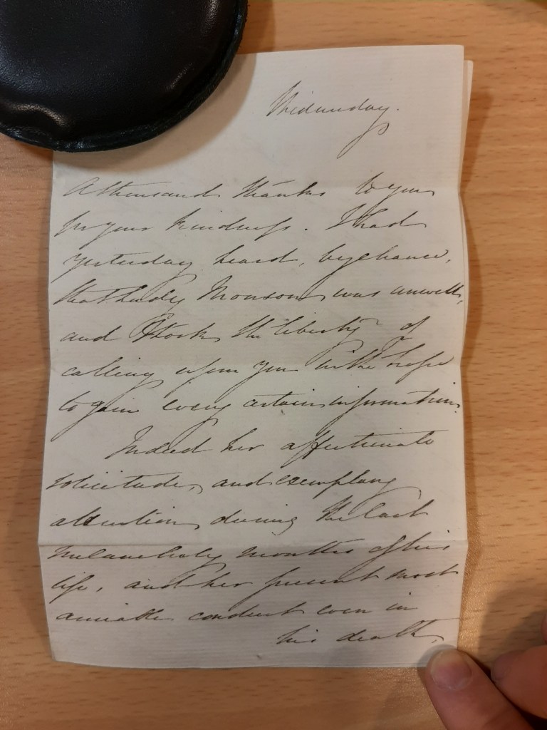 Indeed her affectionate solitude and exemplary attention during the last melancholy months of this life, and her present most amiable conduct even in this death cannot be sufficiently respected or commended, and, though I may feel the admiration she so justly merits, perhaps more than any other person, I do not possess the faculty to express my sincere conviction of her excellence in adequate terms.