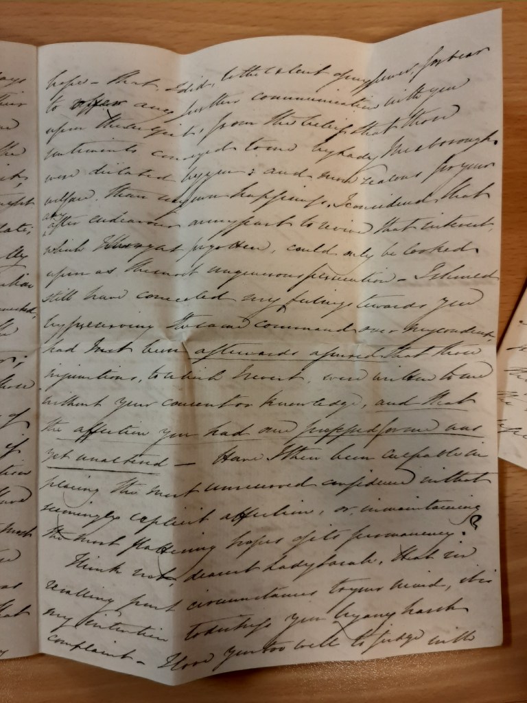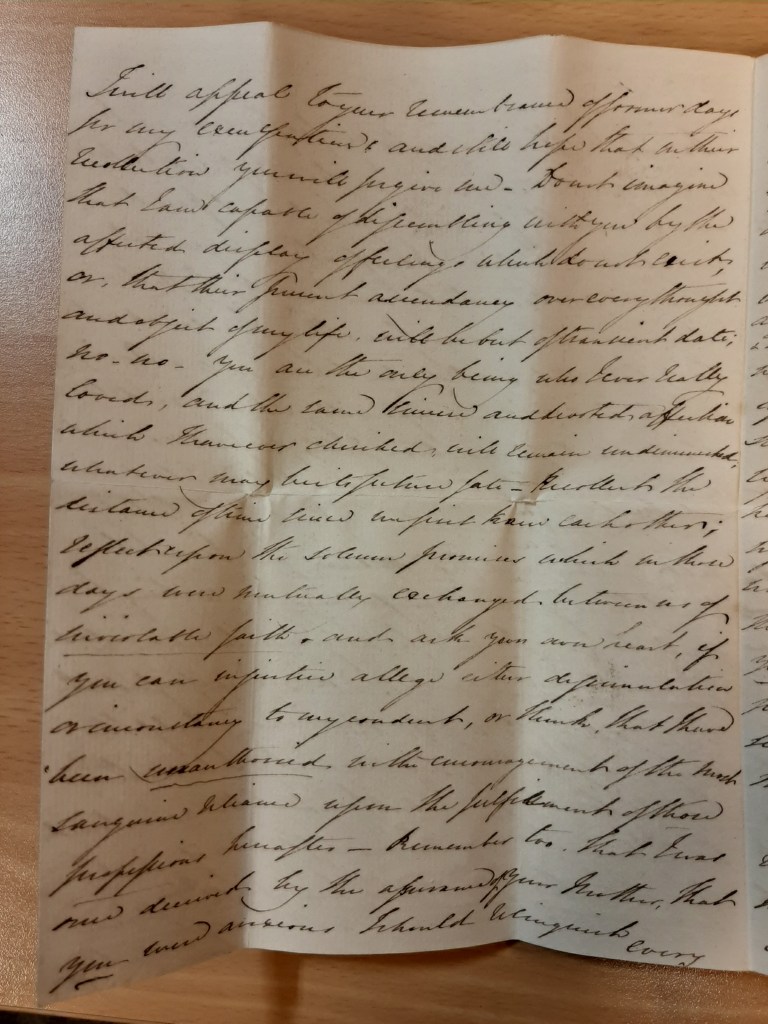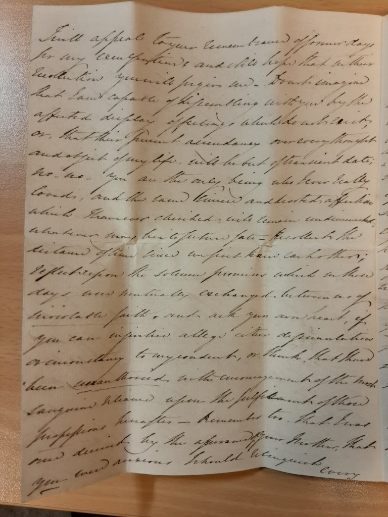 Do not imagine that I am capable of displeasing with you by the affected display of feelings which do not exist, or, that their present ascendancy over every thought and object of my life, will be but of transient date; no, no – you are the only being who I ever really loved, and the same sincere and devoted affection which I have ever cherished, will remain undiminished, whatever may be its future fate – recollect the distance of time since we first knew each other; reflect upon the solemn promises which in those days were mutually exchanged, between us of irresistible faith, and ask your own heart, if you can in justice allege either difinutation or inconstancy to my conduct, or think, that I have been unauthorised with encouragement of the most sanguine reliance upon the fulfilment of those professions hereafter – remember too, that I was near deceived by the assurance of your mother, that you were anxious I should relinquish every hope – that I did, to the extent of my power, forbear to offer any further communication with you upon [?] from the belief that those sentiments conveyed to me by lady Mexborough were dictated by you, and more zealous for your welfare than my own happiness I concluded that any after endeavour on my party to revive that interest, which I have yet begotten could only be looked upon as the most ungenerous persecution, I should still have connected my feelings towards you by preserving the command over my [?] had not been afterwards assured that there injunctions, to which [?] and written to and without your consent or knowledge, and that the affection you had and possessed for me was yet unaltered – have I then been capable in placing the most unreserved confidence without seemingly complicit affection, or, in maintaining the most flattering papers of its permanency?