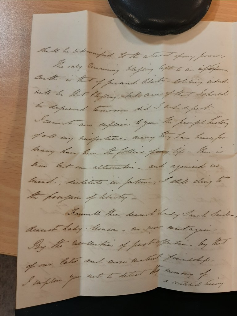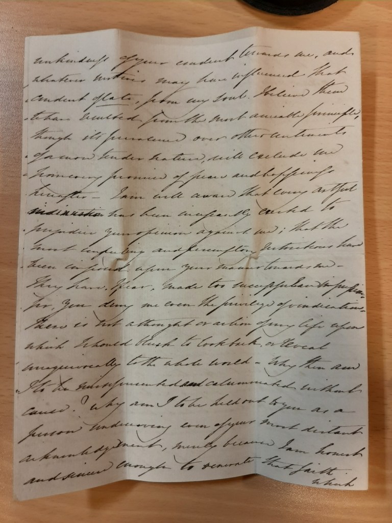Think not dearest lady Sarah that in recalling past circumstance to your mind, it is my intention to distress you by my harsh complaints, I love you too well to judge with unkindness of your conduct towards me, and whatever motives may have influenced that conduct of late, from my soul I believe them to have resulted from the most amiable principle, though its prevalence over other sentiments of a more tender nature, will exclude me from every promise of peace and happiness hereafter – I am well aware that every artful insinuation has been inaccessibly evicted to prejudice your opinion against me, that the most compelling and preceptory intentions have been injured upon your manner towards me – they have, I fear made too successful in possession, for you deny me even the privilege of indication there is not a thought or action of my life upon which I should blush to look back or reveal unequivocally to the whole world. Why then am I to be misrepresented and calumniated without cause?