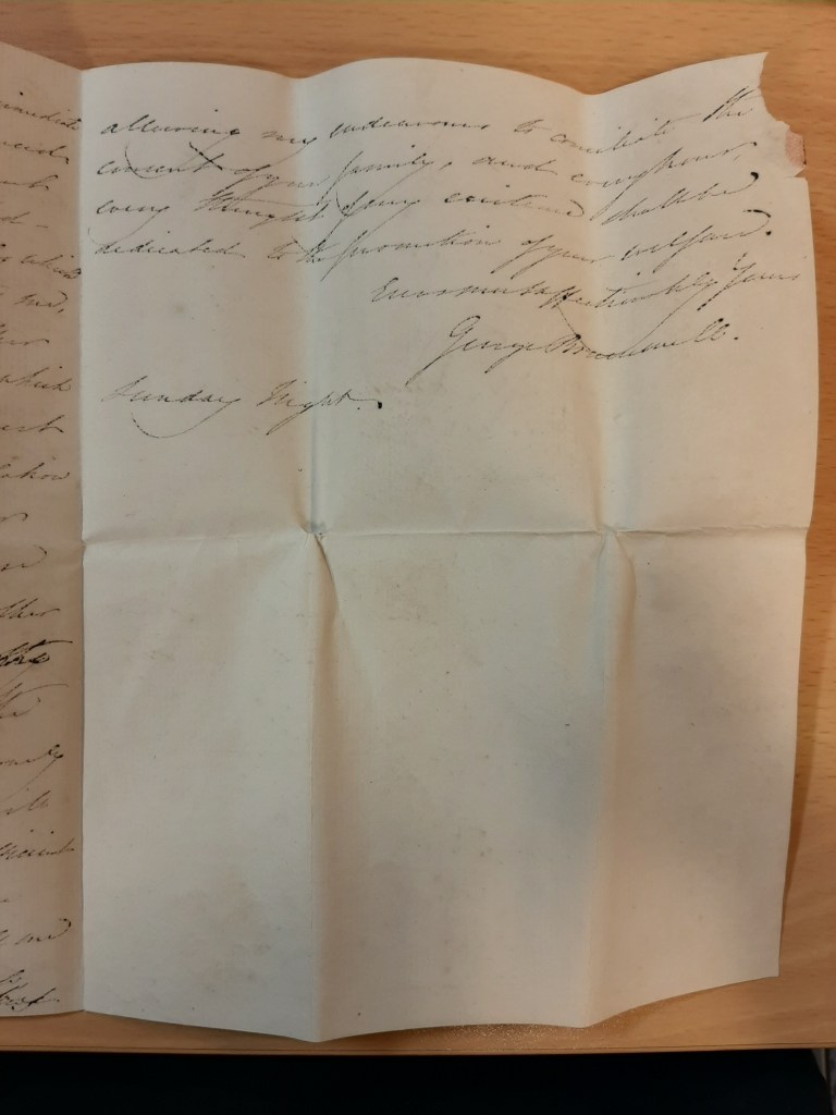 I have since learned that I have been flagrantly deceived by your mother, and that the injunctions which were conveyed to me with so much apparent candour, as the fine transcript of your sentiments, were equally fabricated and illiberal – forgive my presuming to write in terms so harsh and unpleasant of a person who should still be ever dear to you, but, when I am compelled to adopt to the injury I have suffered from that person, I cannot as restrain my indignation. Having satisfactorily ascertained that the letter, which was last to me, was not dictated by you, I do not consider myself, bound as honour or justice to be restricted by the answer which returned, methinks in deference to your stated wishes alone, I unequivocally perceived that the subject as well as the cause when it originated should in future be consigned to oblivion, it is now my most anxious wish to hear from yourself whether it is still my fate to retain that interest with you, of which I was once assured, and which, from my heart I value more than any other perfection in life – you have, indeed, “a thousand reasons” why I can never be allowed to look forward to any nearer title than that of a friend – those reasons, I am convinced are not the result of your own amiable principle or reflection, they have been formed and delivered to you with the most mercenary intentions, and may all be concentrated in one individual objection – that of poverty – still that objection may yet be overcome, those prospects may shortly be realised, without leaving this country, an intention which I repeat, it is in your power to altar or confirm – I entreat you to write to me, even a few words before you leave town.