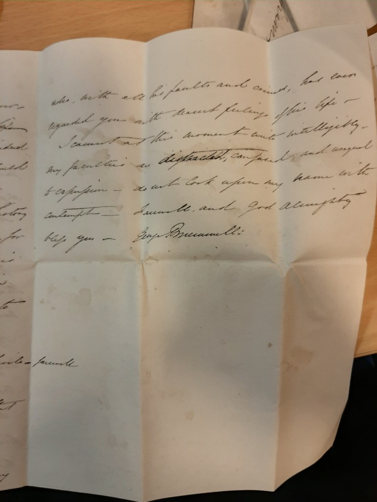 The last letter Sarah receives was on Wednesday 15 May 1816, the day before he escaped London for France. Brummell’s letters conform to the same charming, romantic, poetic, self-righteous and rude character he had possessed for most of his life. Rather than offering a brand new interpretation of the Beau Brummell Ian Kelly and other biographers have painted, these letters confirm the picture of him being a fascinating, alluring shyster in his last dark, fateful days in London, making one final chase for a young woman’s attention, and her chequebook.
