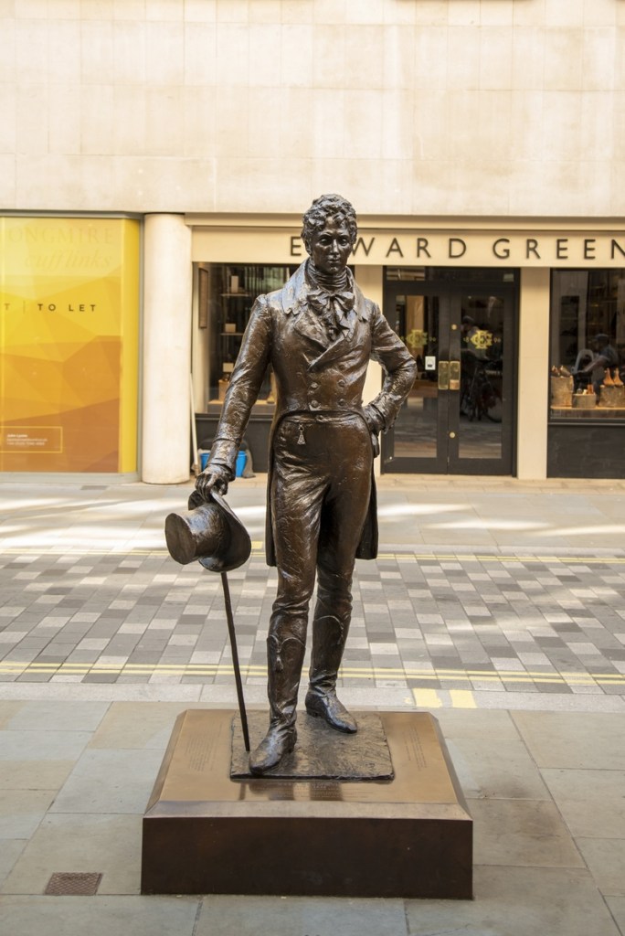 A few days before Christmas, as I perused the district of fashionable London; Bond Street, Burlington Arcade, and the irrepressible Savile Row – to marvel at window dressing and twinkling lights, not to double my mortgage on tailoring FYI – I found myself before the small and diminutive bronze statue of George ‘Beau’ Brummell, the archetypical fashionista who made, or more likely embodied, London, the male fashion capital of the world.